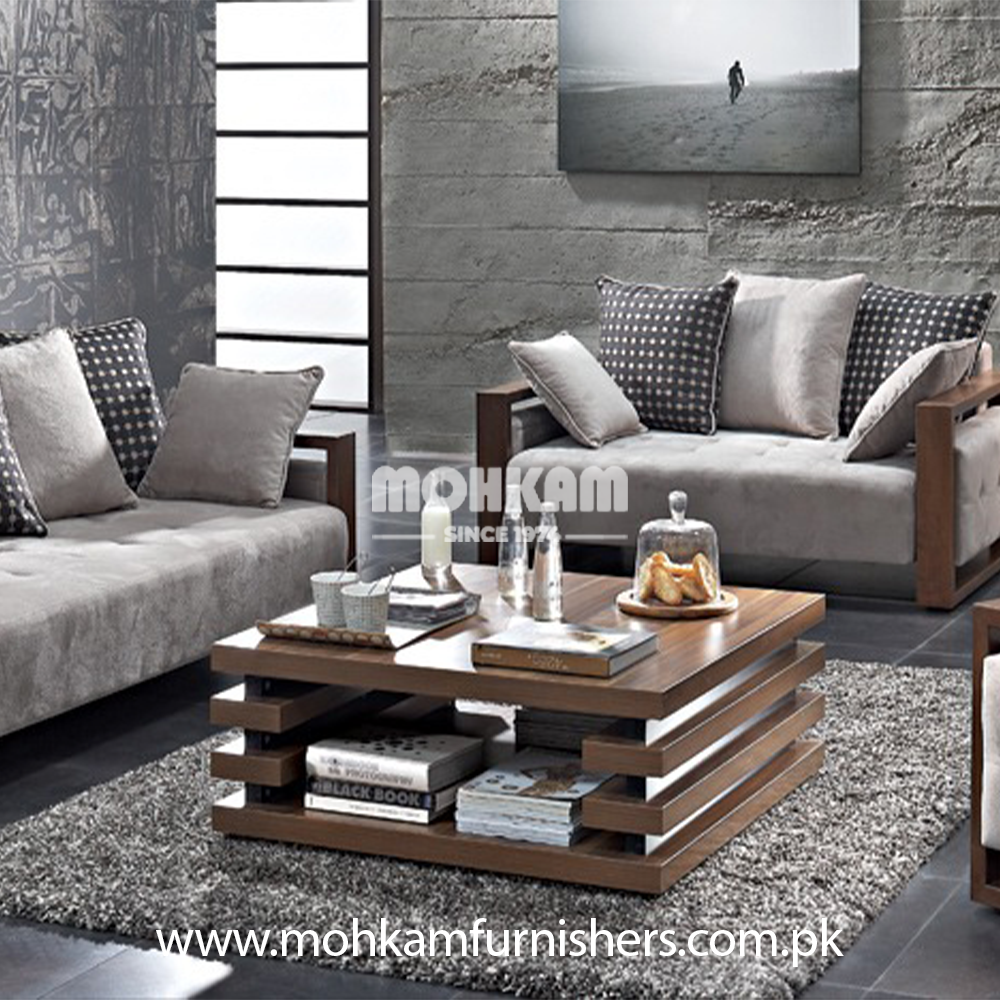 The Block sofa set is a versatile and contemporary collection, designed to be modular and highly functional, depicted here as two pieces of the 3+2+1 arrangement. Each piece features a robust, exposed frame made of dark-stained wood, giving the design a strong, architectural appeal. The seating is upholstered in a durable, textured light gray or taupe fabric, with tufting on the seat cushions that adds a subtle design detail. The low-profile arms are integrated into the wooden frame, emphasizing the clean, straight lines of the "block" aesthetic. Comfort is provided by numerous scatter-back cushions, mixing solid gray tones with a graphic black-and-white geometric pattern, which introduces a dynamic contrast to the otherwise muted and industrial setting. The overall look is modern and grounded, perfect for a loft or contemporary space.