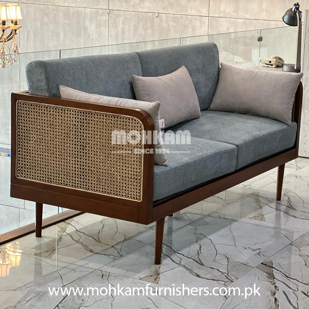 The Hawkins 2.5 seater sofa is a stylish piece that seamlessly blends mid-century modern design with a light, contemporary aesthetic. The sofa features a warm, dark-stained solid wood frame that is elevated on sleek, tapered legs. Its most distinctive characteristic is the cane webbing panel integrated into the side of the frame, which adds a beautiful textural contrast and a classic, natural element to the design. The seating and back cushions are upholstered in a cool, muted slate blue or gray fabric, offering a comfortable and clean-lined look. This piece is finished with several loose pillows in a soft, light greige or taupe hue, providing both lumbar support and a subtle contrast to the blue upholstery. The sofa's sophisticated mix of wood, cane, and fabric makes it an elegant addition to a modern or transitional living space.